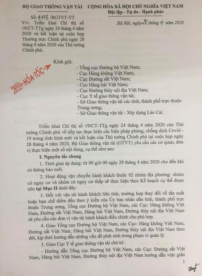 Bộ GTVT yêu cầu các cơ quan, đơn vị thực hiện các giải pháp bảo đảm vận tải hành khách áp dụng từ 00 giờ 00 ngày 29/4/2020 cho đến khi có thông báo mới đối với hoạt động vận chuyển hành khách thuộc 02 nhóm địa phương: nhóm có nguy cơ và nhóm có nguy cơ thấp.