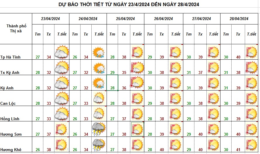 Thời kỳ từ ngày 25 đến ngày 28/4, vùng áp thấp nóng phía Tây hoạt động mạnh trở lại, gió tây nam mạnh lên, nắng nóng gia tăng về cường độ và mở rộng ra toàn tỉnh với nhiều khu vực nắng nóng gay gắt, vùng núi phía Tây và Tp Hà Tĩnh nắng nóng đặc biệt gay gắt. Nhiệt độ cao nhất xảy ra ngày 25/4 các khu vực phổ biến 36 – 38°C, từ ngày 26 – 28/4 nhiệt độ tăng lên 38 – 40°C, vùng núi và Tp Hà Tĩnh 40 - 41°C. Nhiệt độ thấp nhất vào đêm và sáng sớm 28 – 30°C. Độ ẩm không khí trung bình giảm thấp xuống mức 60 – 65%. Gió tây nam cấp 3, cấp 4, phía nam có lúc cấp 5, giật cấp 6.