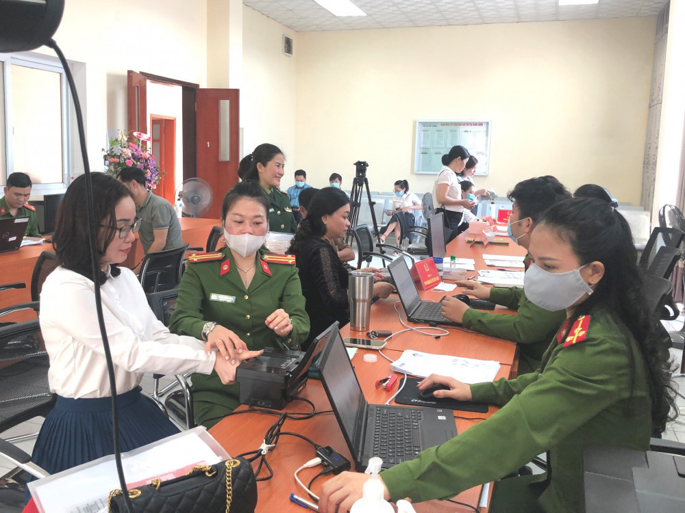 Cán bộ Công an tiến hành thủ tục cấp CCCD cho người dân.