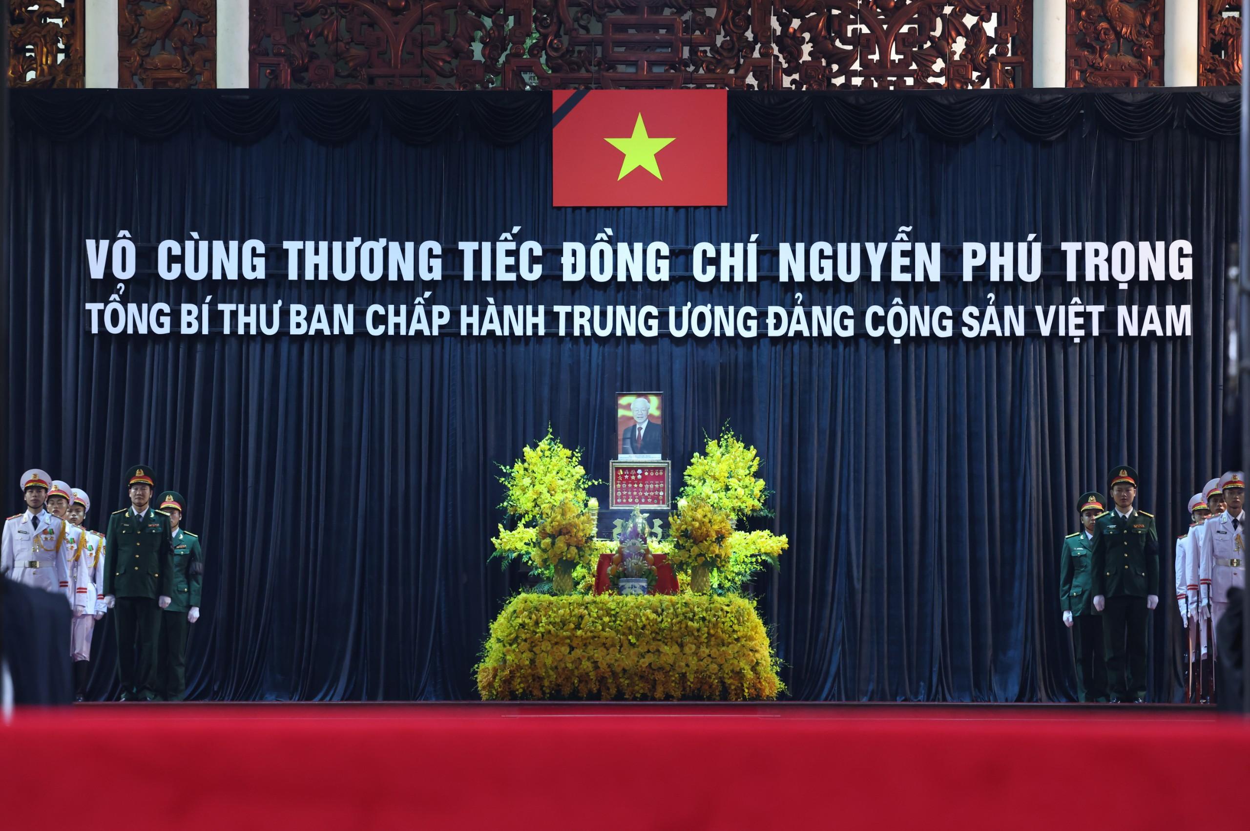 Linh cữu Tổng Bí thư Nguyễn Phú Trọng quàn tại Nhà Tang lễ Quốc gia, số 5 Trần Thánh Tông, Hà Nội.