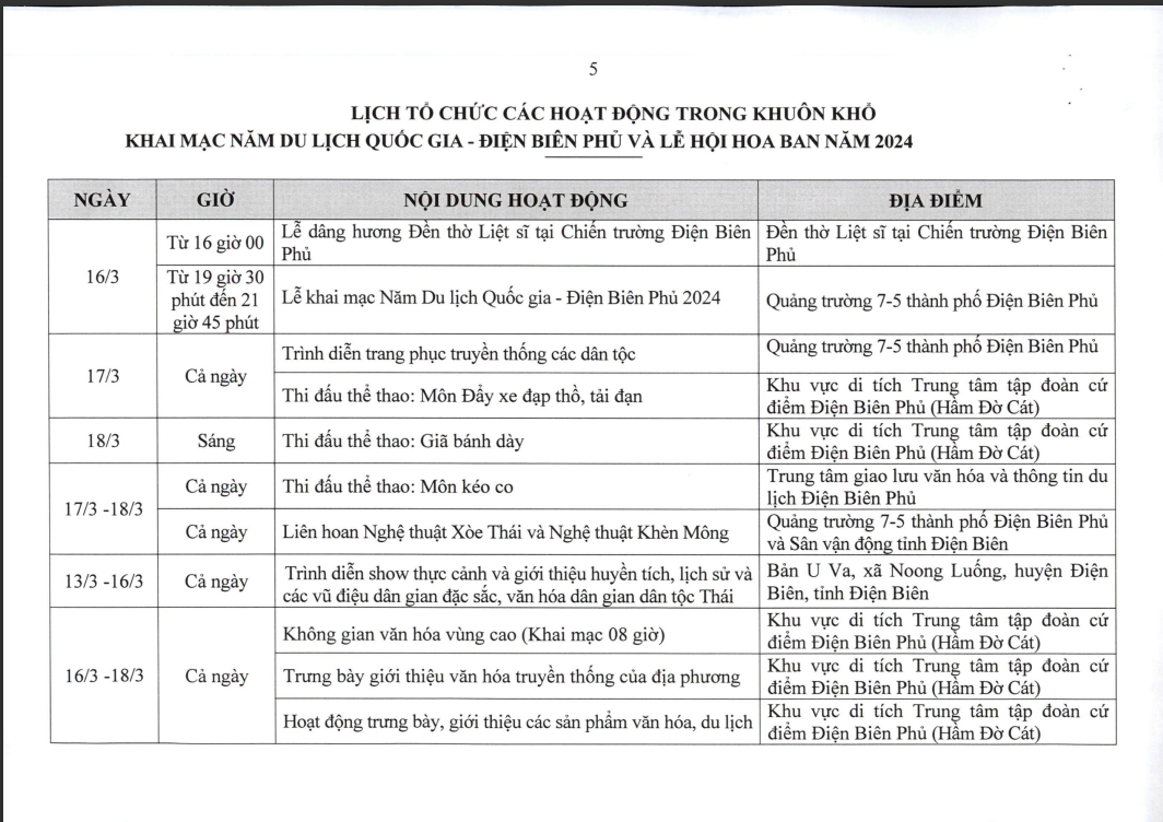Lễ khai mạc Năm du lịch quốc gia Điện Biên và Lễ hội Hoa Ban năm 2024 sẽ diễn ra từ tháng 1/2024 đến tháng 5/2024. Các hoạt động chính trong khuôn khổ lễ hội từ ngày 13 - 18/3/2024 tại thành phố Điện Biên Phủ, gồm: Lễ dâng hương tại Đền thờ Liệt sĩ tại Chiến trường Điện Biên Phủ; Lễ khai mạc Năm du lịch quốc gia Điện Biên 2024 với chủ đề “Về miền Hoa Ban” với chương trình nghệ thuật đặc sắc và màn bắn pháo hoa nổ rực rỡ dự kiến diễn ra vào 19 giờ 30 phút ngày 16/3 tại Quảng Trường 7-5 thành phố Điện Biên Phủ.