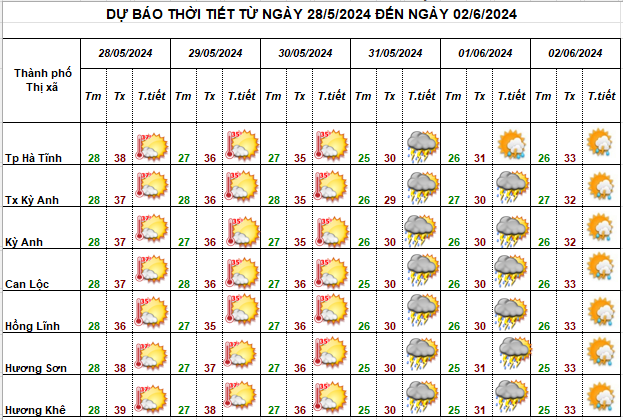 Theo Đài khí tượng Thủy văn Hà Tĩnh dự báo: Ngày 28 - 30/5, rãnh áp thấp nối vùng áp thấp phía Tây cùng với đới gió Tây Nam tiếp tục chi phối thời tiết trên phạm vi toàn tỉnh do đó khu vực duy trì nắng nóng và nắng nóng gay gắt với nhiệt cao nhất ngày phổ biến 36 - 380C, riêng Hương Khê có khả năng đạt trên ngưỡng 38 độ C, nhiệt độ thấp nhất 28 – 300C, độ ẩm không khí 72 – 77%. Gió tây nam cấp 2, cấp 3.
