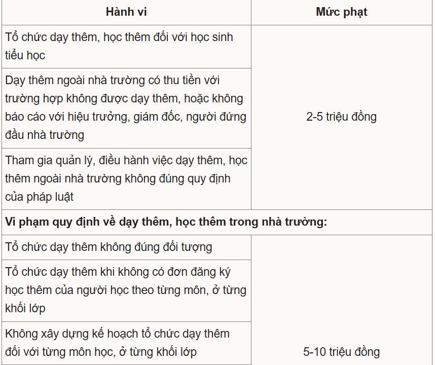 Theo đó, cá nhân, tổ chức dạy thêm cho học sinh tiểu học; dạy thêm có thu tiền học sinh chính khóa hoặc dạy thêm ngoài nhà trường nhưng không báo với hiệu trưởng; tham gia quản lý, điều hành việc dạy thêm, học thêm ngoài nhà trường không đúng quy định, sẽ bị phạt 2-5 triệu đồng.