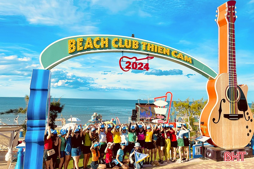Du khách ngoại tỉnh check in tại biển Thiên Cầm (Cẩm Xuyên) dịp cuối tuần tháng 6/2024.