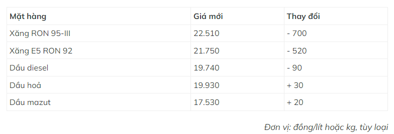 Giá xăng, dầu thay đổi như sau: