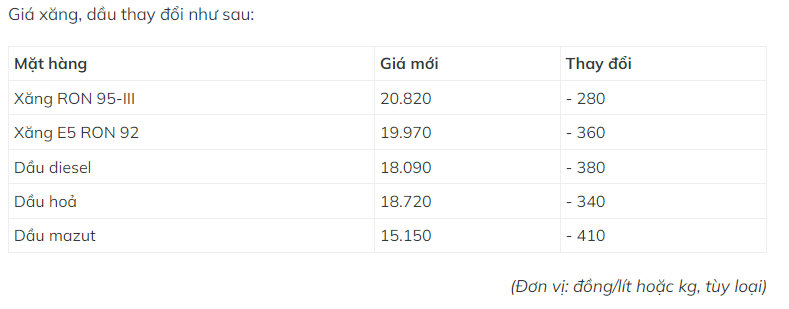 Giá xăng RON 95-III (loại phổ biến trên thị trường) giảm 280 đồng, xuống 20.820 đồng một lít. Còn E5 RON 92 ở mức 19.970 đồng một lít, hạ 360 đồng. Các mặt hàng dầu