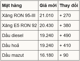 Giá xăng RON 95-III (loại phổ biến trên thị trường) tăng 270 đồng, lên 21.010 đồng một lít. E5 RON 92 thêm 380 đồng, ở mức 20.430 đồng. Tương tự, các mặt hàng dầu t