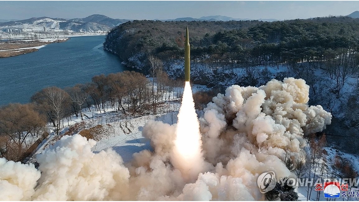Bức ảnh do hãng thông tấn Triều Tiên đăng ngày 15/1, cho thấy vụ phóng tên lửa đạn đạo tầm trung nhiên liệu rắn (IRBM) mang đầu đạn siêu thanh. Ảnh: KCNA