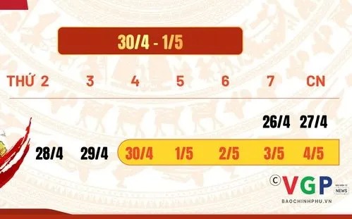 Dịp lễ 30/4 - 1/5, người dân cả nước sẽ được nghỉ liên tiếp 5 ngày, từ thứ Tư (30/4) đến hết Chủ nhật (4/5). Để bù cho kỳ nghỉ dài này, người lao động sẽ đi làm vào thứ Bảy, ngày 26/4. Đối với các cơ quan, đơn vị không áp dụng lịch nghỉ cố định vào thứ Bảy và Chủ nhật, lịch nghỉ sẽ được bố trí linh hoạt theo kế hoạch cụ thể của từng đơn vị.