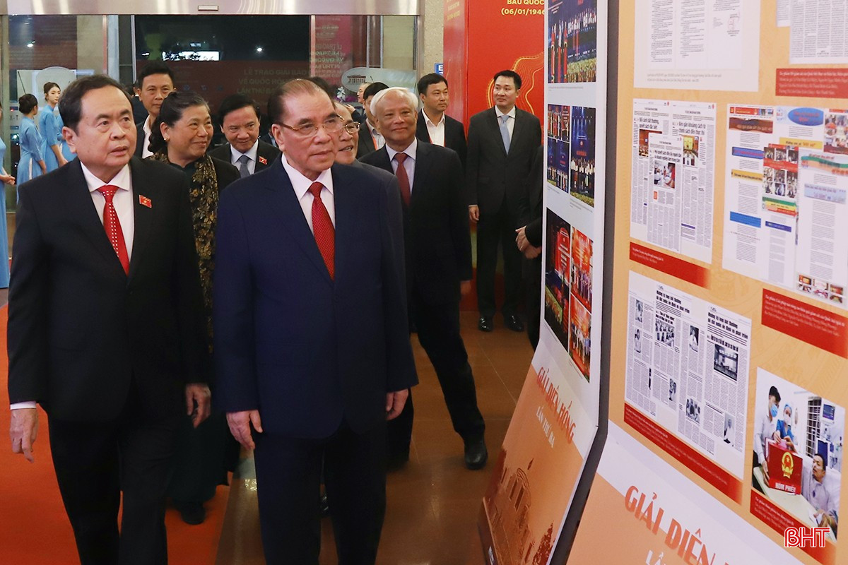 Nguyên Tổng Bí thư Nông Đức Mạnh; Ủy viên Bộ Chính trị, Chủ tịch Quốc hội Trần Thanh Mẫn và các đồng chí lãnh đạo theo dõi triển lãm ảnh bên lề lễ trao giải.