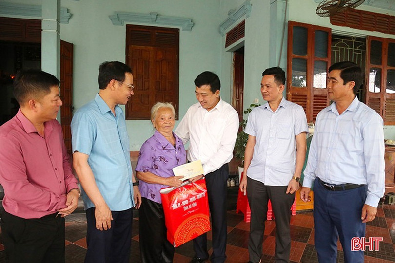 Phó Chủ tịch Thường trực HĐND tỉnh Trần Tú Anh và lãnh đạo Sở Nội vụ, huyện Nghi Xuân tặng quà cho bà Phan Thị Tâm - vợ liệt sỹ Phan Văn Tri ở xã Xuân Yên nhân dịp kỷ niệm 50 năm Ngày Giải phóng miền Nam, thống nhất đất nước (30/4/1975 – 30/4/2025). Ảnh tư liệu. Ảnh BHT.