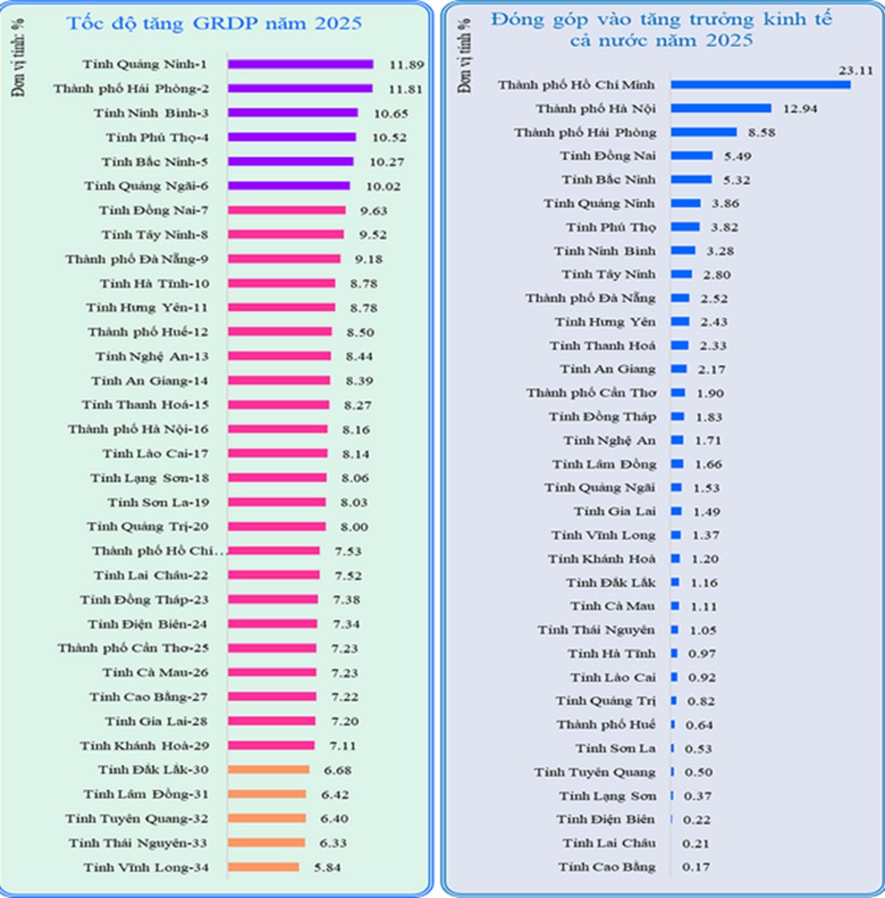 Cục Thống kê (Bộ Tài chính) thông tin: Tốc độ tăng trưởng tổng sản phẩm trên địa bàn (GRDP) của các địa phương năm 2025 dao động từ 5,84% - 11,89%. Phần lớn các địa phương có tốc độ tăng trưởng trên 7% (chỉ có 5 tỉnh có tốc độ tăng trưởng dưới 7%).
