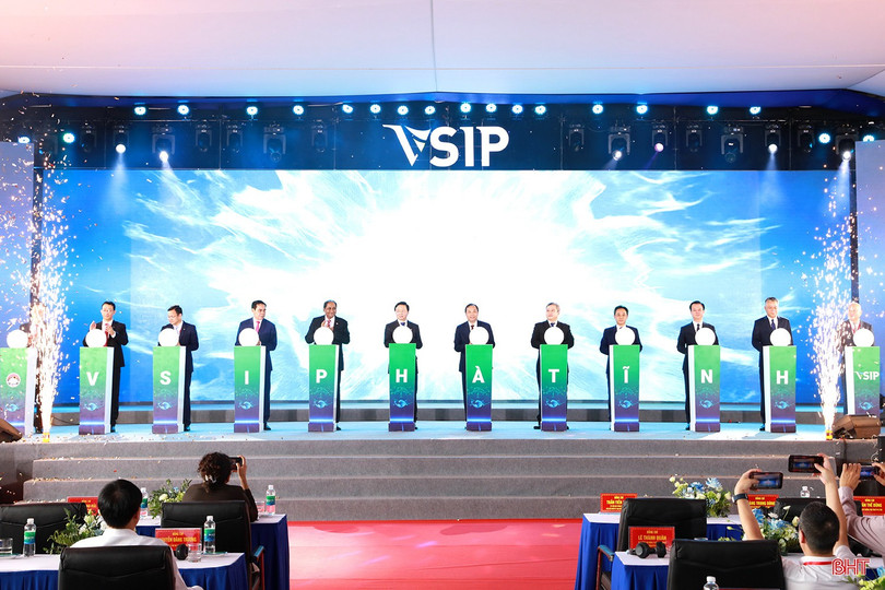 Phó Thủ tướng Chính phủ Trần Hồng Hà cùng lãnh đạo tỉnh, nhà đầu tư và các đại biểu thực hiện nghi thức ấn nút chính thức khởi công dự án VSIP Hà Tĩnh vào tháng 6/2024.