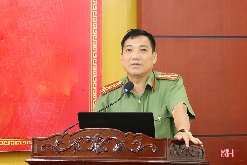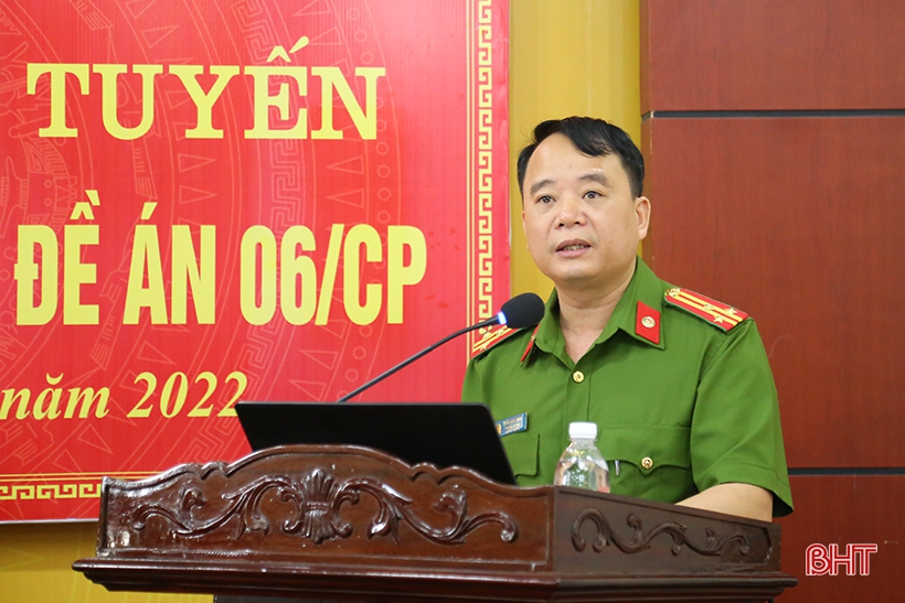 Thượng tá Trần Hữu Cảnh - Trưởng phòng Cảnh sát QLHC về TTXH (Công an tỉnh Hà Tĩnh) báo cáo tiến độ thực hiện Đề án 06 trên địa bàn tỉnh.