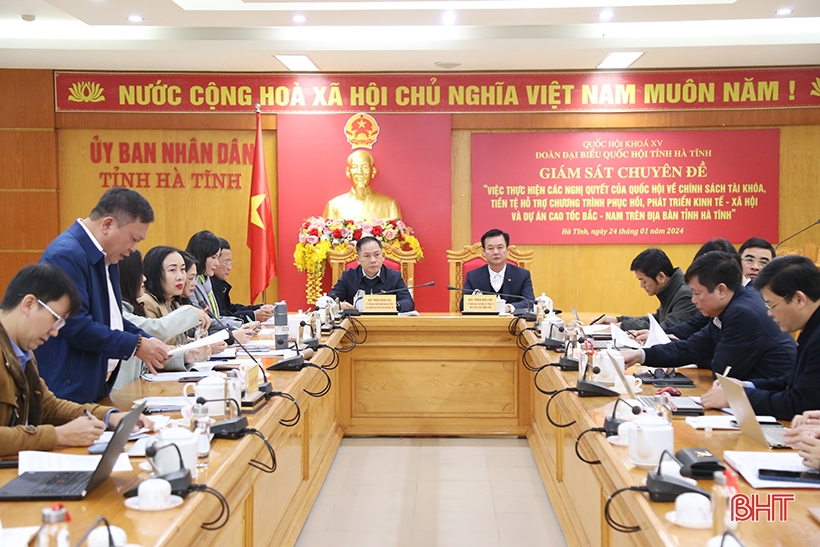 Thực hiện Kế hoạch số 293/KH-ĐGS ngày 27/11/2023 về việc triển khai giám sát chuyên đề “Việc thực hiện Nghị quyết số 43/2022/QH15 ngày 11/1/2022 của Quốc hội về chính sách tài khóa, tiền tệ hỗ trợ Chương trình phục hồi, phát triển kinh tế - xã hội và các nghị quyết của Quốc hội về một số dự án quan trọng quốc gia đến hết năm 2023 trên địa bàn tỉnh Hà Tĩnh”, sáng 24/1, Đoàn giám sát của Đoàn ĐBQH tỉnh Hà Tĩnh đã làm việc với UBND tỉnh và các sở, ngành, đơn vị liên quan.
