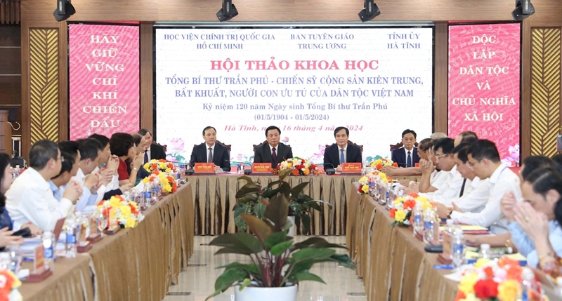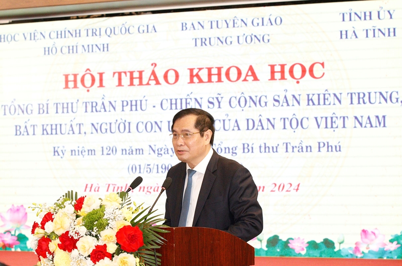 Phát biểu khai mạc và đề dẫn Hội thảo, GS.TS Nguyễn Xuân Thắng, Ủy viên Bộ Chính trị, Giám đốc Học viện Chính trị quốc gia Hồ Chí Minh, Chủ tịch Hội đồng Lý luận Trung ương nhấn mạnh, Hội thảo là hoạt động thiết thực nhằm ôn lại cuộc đời hoạt động cách mạng cao đẹp, vẻ vang của đồng chí Trần Phú - Tổng Bí thư đầu tiên của Đảng, người con ưu tú của dân tộc Việt Nam và quê hương Hà Tĩnh, đã phấn đấu, hy sinh trọn đời cho sự nghiệp cách mạng của Đảng và dân tộc; đồng thời, bày tỏ sự tri ân sâu sắc của các thế hệ hôm nay đối với những cống hiến của đồng chí Trần Phú cho thắng lợi của sự nghiệp cách mạng, góp phần giáo dục truyền thống, lý tưởng cách mạng cho các cán bộ, đảng viên và các tầng lớp nhân dân, đặc biệt là thế hệ trẻ.