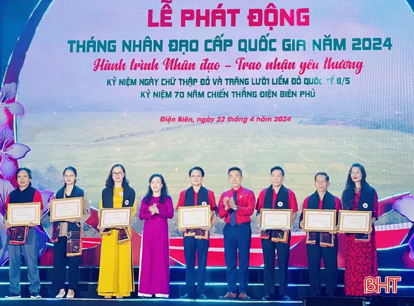 Hà Tĩnh xếp thứ 2 toàn quốc trong chiến dịch "Triệu bước chân nhân ái". Trong ảnh: Chủ tịch Hội Chữ thập đỏ tỉnh Mai Lê Thuộc (thứ 3 từ phải sang) nhận bằng khen của BTC tại lễ phát động Tháng Nhân đạo cấp quốc gia năm 2024.