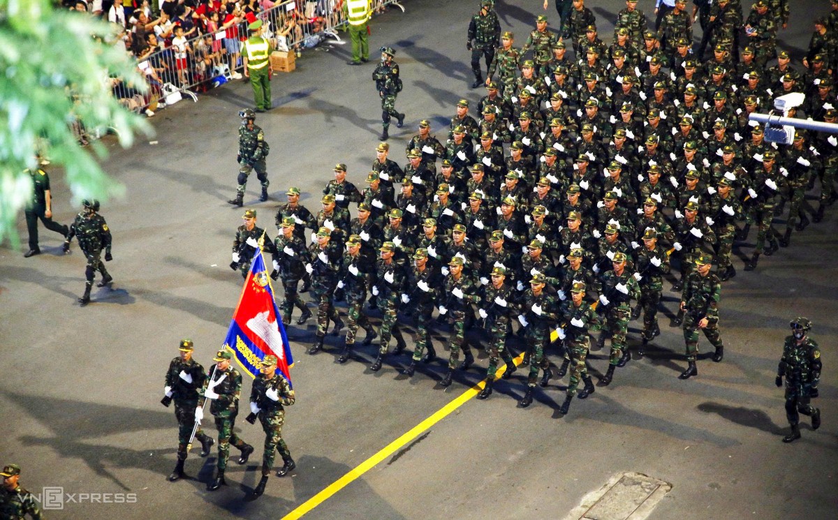 Đoàn quân nhân Campuchia sải bước diễu hành trên phố Cửa Nam, Hà Nội. Họ đến sân bay Nội Bài hôm 15/8 để chuẩn bị cho lễ diễu binh diễu hành. Ảnh: Võ Hải