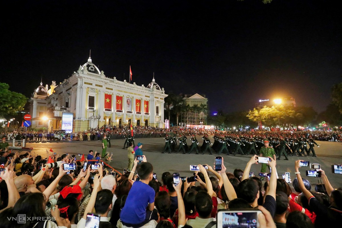 Các khối lực lượng vũ trang diễu hành qua Nhà hát Lớn. Tại đây hàng nghìn người hò reo, chụp hình, quay phim lưu niệm. Ảnh: Hiếu Lương
