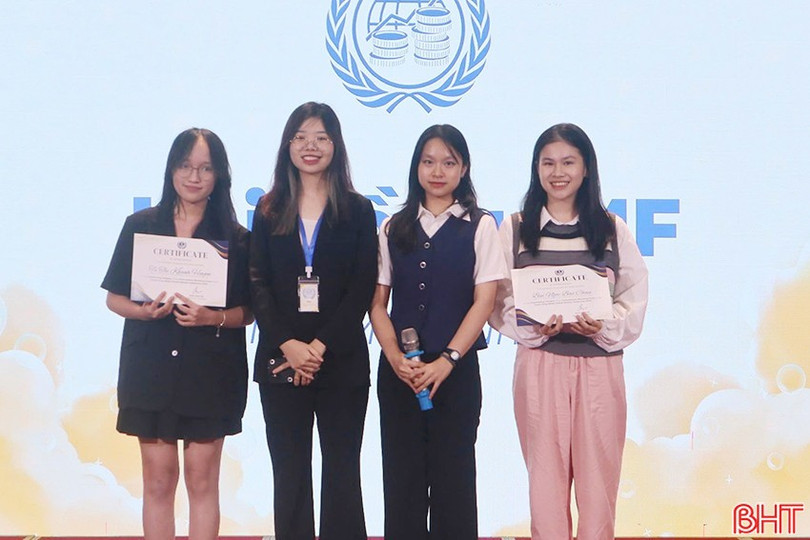 Bùi Ngọc Bảo Châu (đầu tiên từ phải sang) nhận giải đại biểu nổi bật ở Hội nghị mô phỏng Liên hợp quốc YUMUN’24 thanh thiếu niên tỉnh Nghệ An - Hà Tĩnh năm 2024.