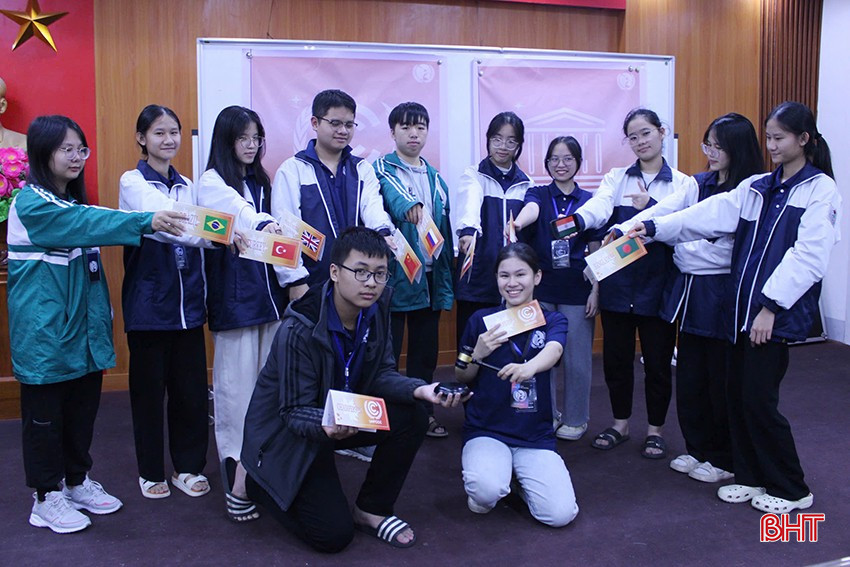 Bùi Ngọc Bảo Châu (hàng dưới, bên phải) với nhiều năm kinh nghiệm lãnh đạo hội nhóm mô phỏng Liên hợp quốc tại Trường THPT Chuyên Hà Tĩnh.