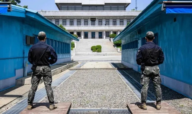 Binh sĩ Hàn Quốc đứng gác tại làng đình chiến Panmunjom trong Khu vực an ninh chung (JSA) của Khu phi quân sự (DMZ) ngăn cách Triều Tiên và Hàn Quốc (Ảnh: AFP)Ngày 1