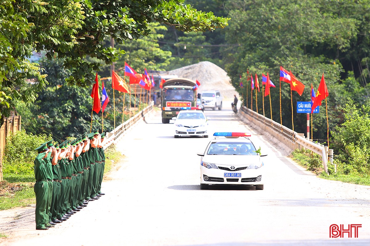 Đúng 14 giờ 30 phút, đoàn xe di chuyển đưa hài cốt liệt sỹ hy sinh tại Lào rời Cửa khẩu quốc tế Cầu Treo về Nghĩa trang liệt sỹ Nầm.