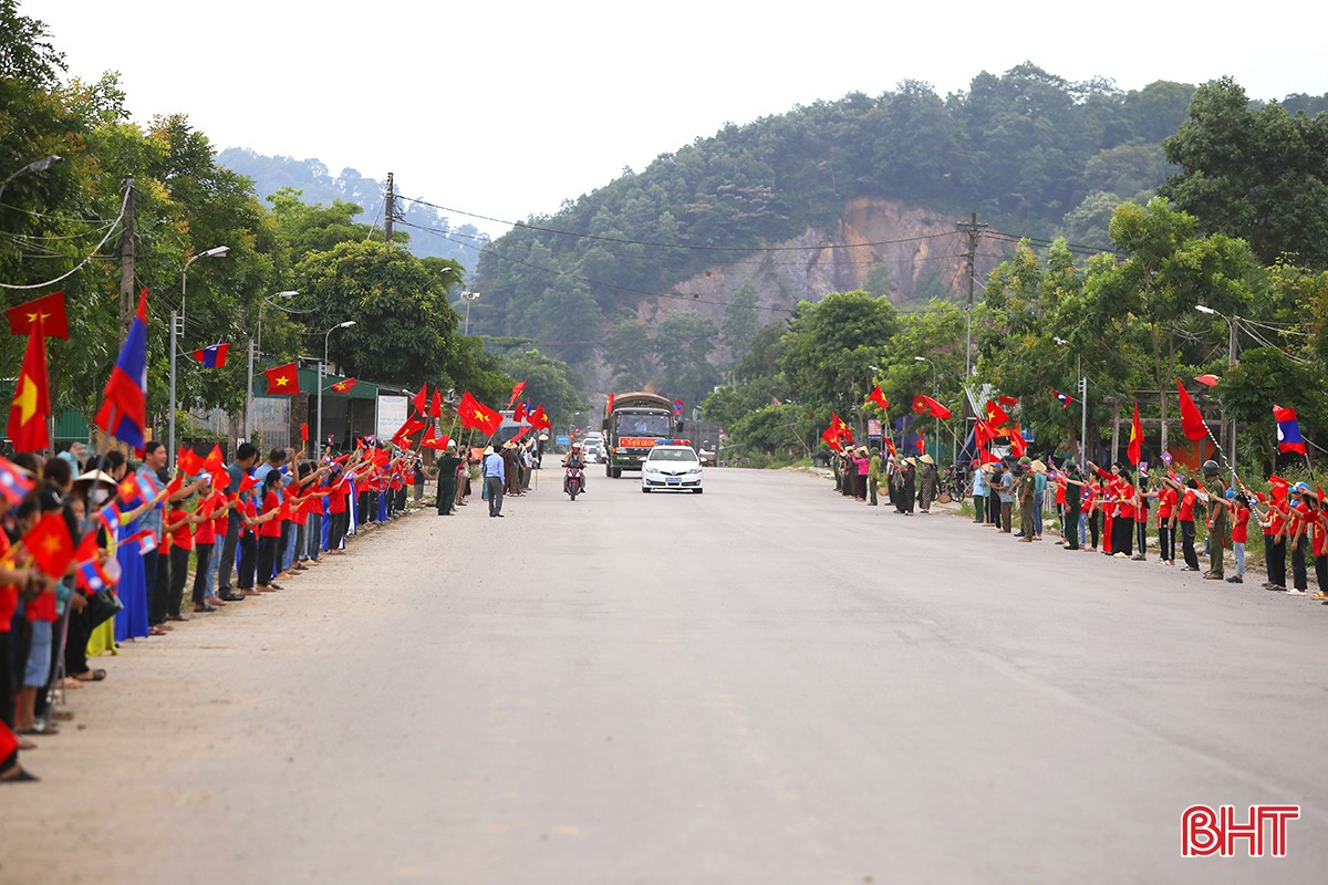 Sau lễ đón nhận và dâng hương diễn ra tại Cửa khẩu quốc tế Cầu Treo, 14 giờ 30 phút chiều 16/5, đoàn xe di chuyển hài cốt liệt sỹ quân tình nguyện và chuyên gia Việt Nam hy sinh tại Lào về Nghĩa trang liệt sỹ Nầm ở xã Sơn Châu, huyện Hương Sơn.