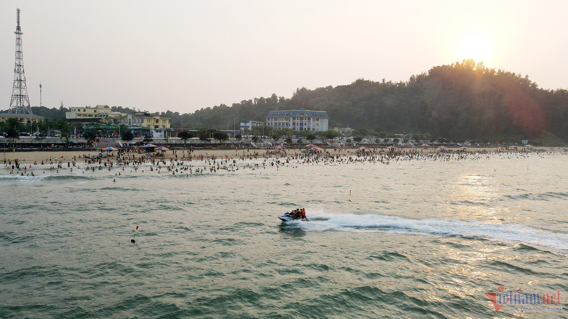Càng về chiều tối, lượng khách đổ về bãi biển Thiên Cầm ngày một thêm đông đúc hơn. Cả bãi tắm dài khoảng 3 km nườm nượp người. (Ảnh BHT)