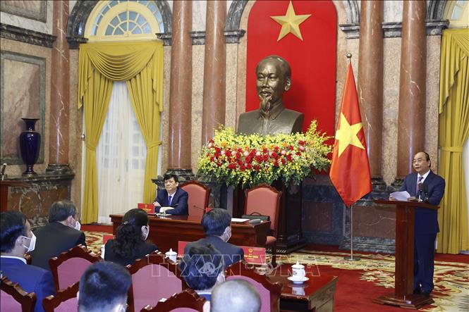 Chủ tịch nước Nguyễn Xuân Phúc phát biểu tại buổi gặp mặt. Ảnh: Thống Nhất/TTXVN Cùng dự có lãnh đạo Văn phòng Chủ tịch nước, Bộ Y tế, một số ban, bộ, ngành Trung ư