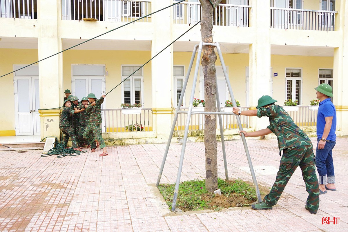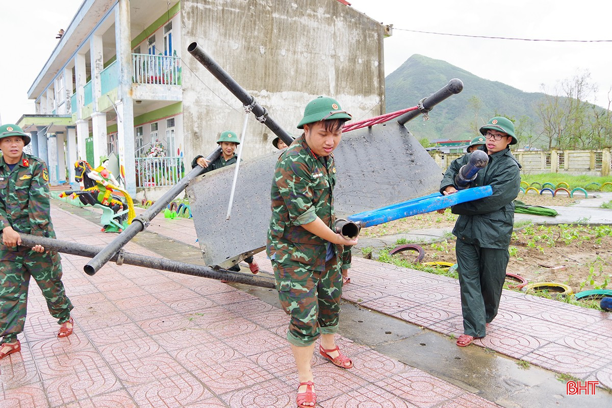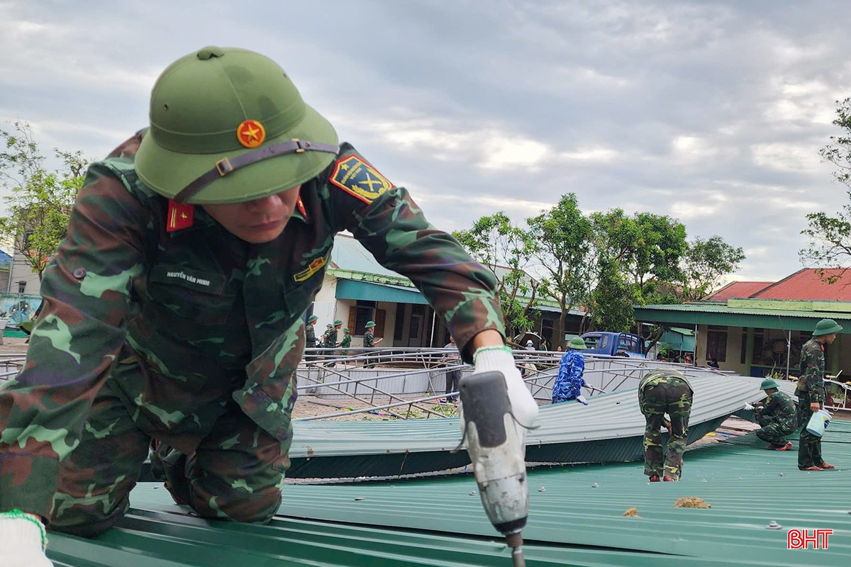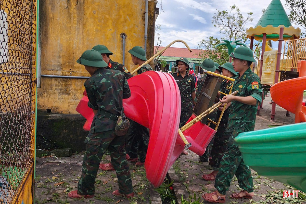 Ở hướng khác, gần 50 cán bộ, chiến sĩ Trung đoàn 841 và bộ đội biên phòng đang tích cực khắc phục tại Trường Mầm non Lộc Hà (xã Lộc Hà) như dọn dẹp vật dụng hư hỏng, cắt tỉa cây gãy đổ, sửa sang khu vui chơi. Hiệu trưởng Trần Thị Thủy xúc động: “Bão đã làm tốc mái toàn bộ dãy nhà cấp 4, nhiều đồ dùng học tập hư hỏng. Các chú bộ đội có mặt kịp thời giúp dọn dẹp, sửa chữa, tiếp thêm niềm tin để các cháu sớm trở lại trường”.