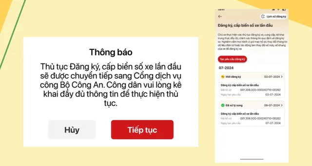 - Cổng dịch vụ công, Ứng dụng định danh quốc gia thông báo mã dịch vụ công và biển số xe được cấp cho chủ xe; hướng dẫn nộp tiền lệ phí đăng ký xe qua tin nhắn điện thoại hoặc địa chỉ thư điện tử hoặc thông báo trên Ứng dụng định danh quốc gia để chủ xe nộp tiền lệ phí qua tiện ích thanh toán được tích hợp trên cổng dịch vụ công, Ứng dụng định danh quốc gia.