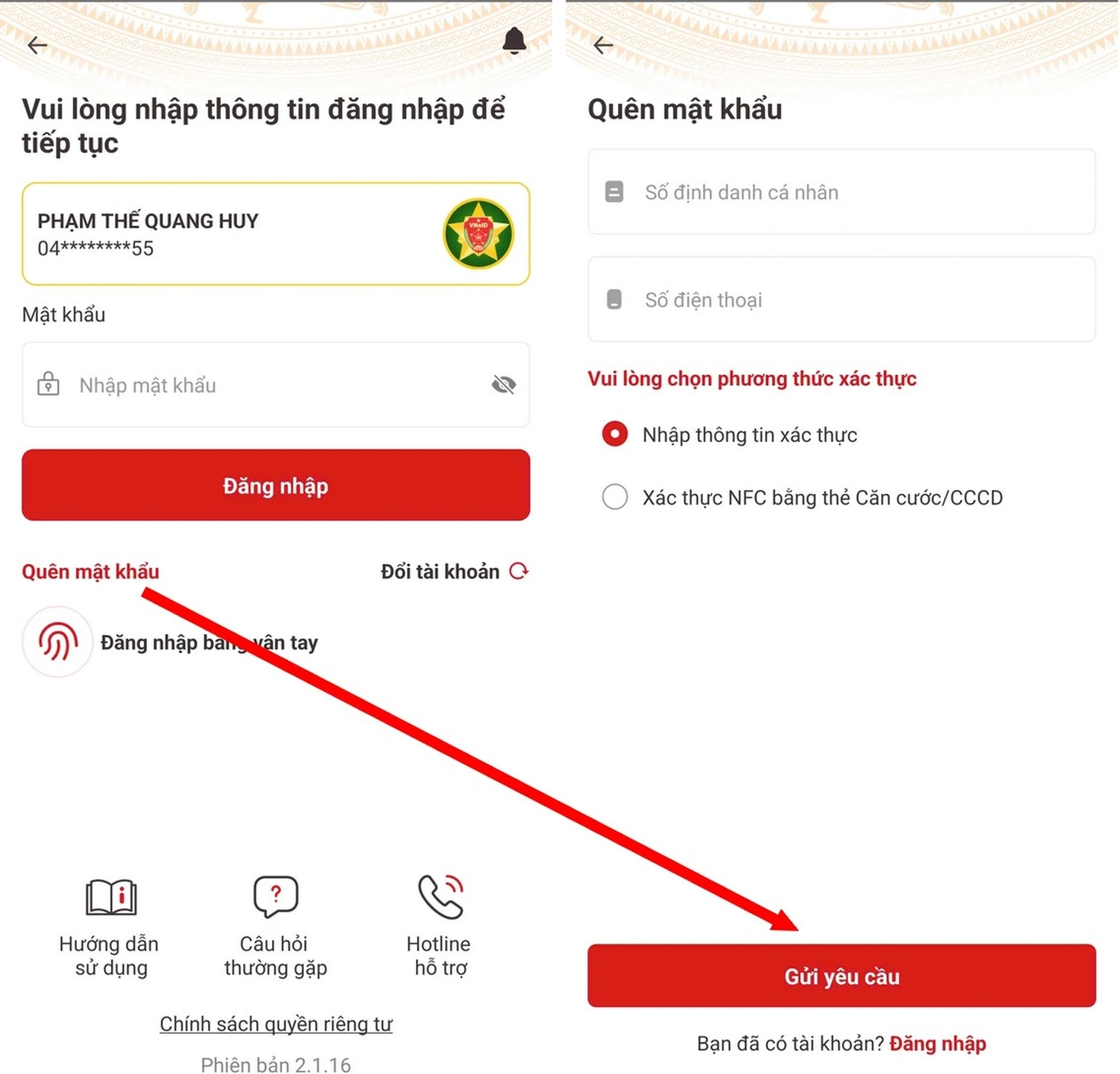 Trong trường hợp không nhớ mật khẩu đăng nhập ứng dụng VNeID, bạn chọn "Quên mật khẩu", điền số định danh cá nhân (số căn cước công dân), số điện thoại vào khung trống, sau đó nhấn nút "Gửi yêu cầu" và thực hiện theo các bước để tạo mới mật khẩu.