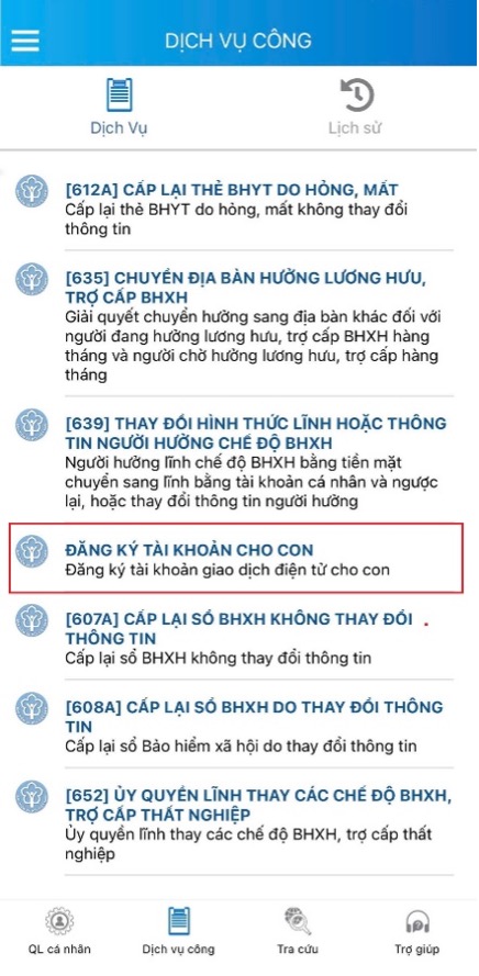 (1) Đăng nhập ứng dụng VssID – BHXH số; (2) Vào tab Dịch vụ công; (3) Chọn dịch vụ Đăng ký tài khoản cho con; (4) Điền đầy đủ thông tin gồm mã số BHXH hoặc mã số BHYT (10 số cuối của mã số thẻ BHYT đối với mẫu cũ); (5) Tải ảnh chân dung 4x6 và ảnh Giấy khai sinh theo hướng dẫn rồi bấm "Tiếp tục"; (6) Ứng dụng sẽ thông báo Cơ quan BHXH tiếp nhận và Cam kết về tính chính xác của nội dung đăng ký, tại đây người dân bấm "Đồng ý", và nhập OTP được gửi đến email đã đăng ký VssID.