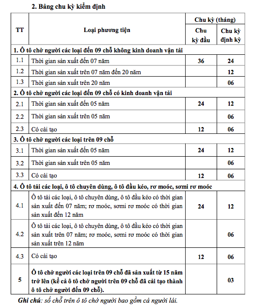 Chu kỳ đăng kiểm ô tô mới nhất được quy định tại Phụ lục V ban hành kèm theo Thông tư 02/2023/TT-BGTVT như sau: