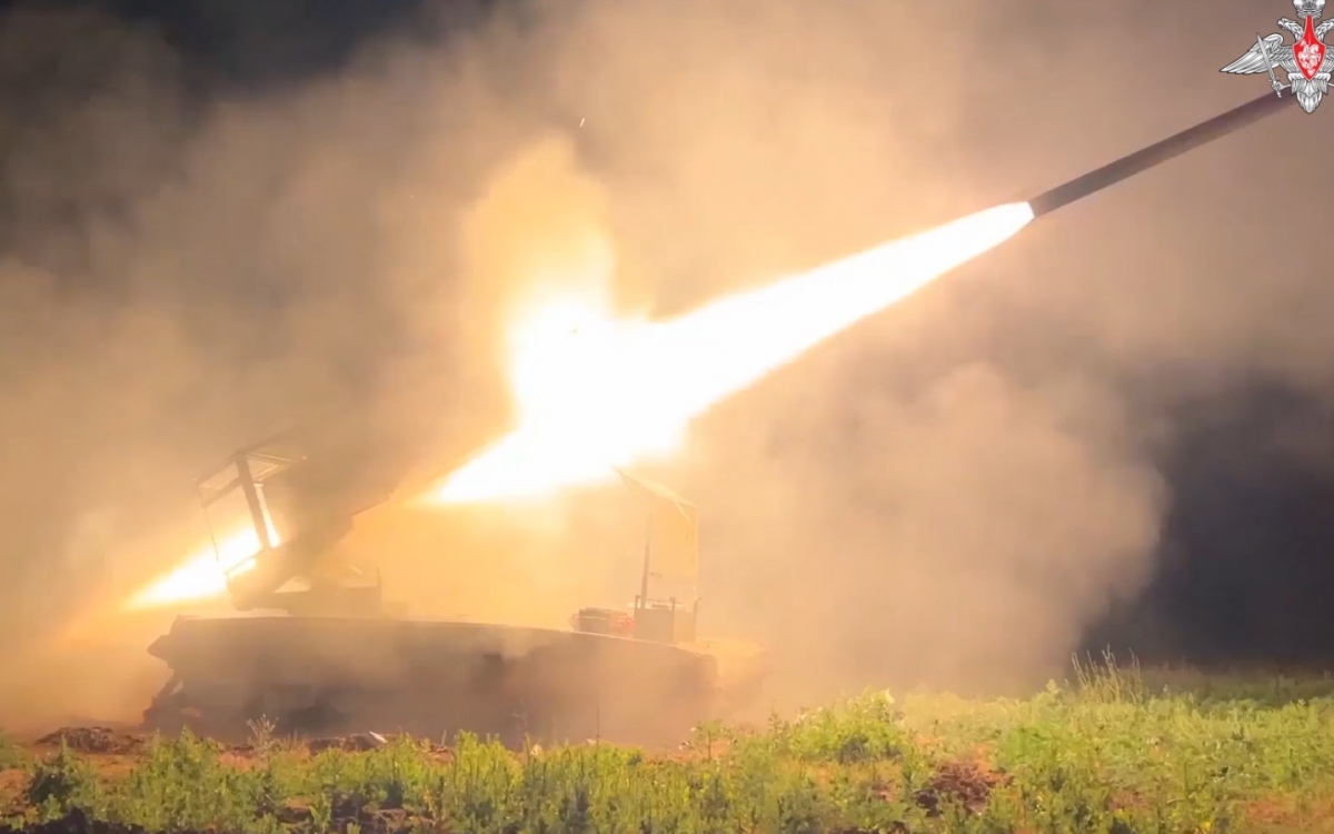 Pháo phản lực nhiệt áp TOS-1A của Nga khai hỏa trong xung đột Ukraine. Ảnh: Bộ Quốc phòng Nga.