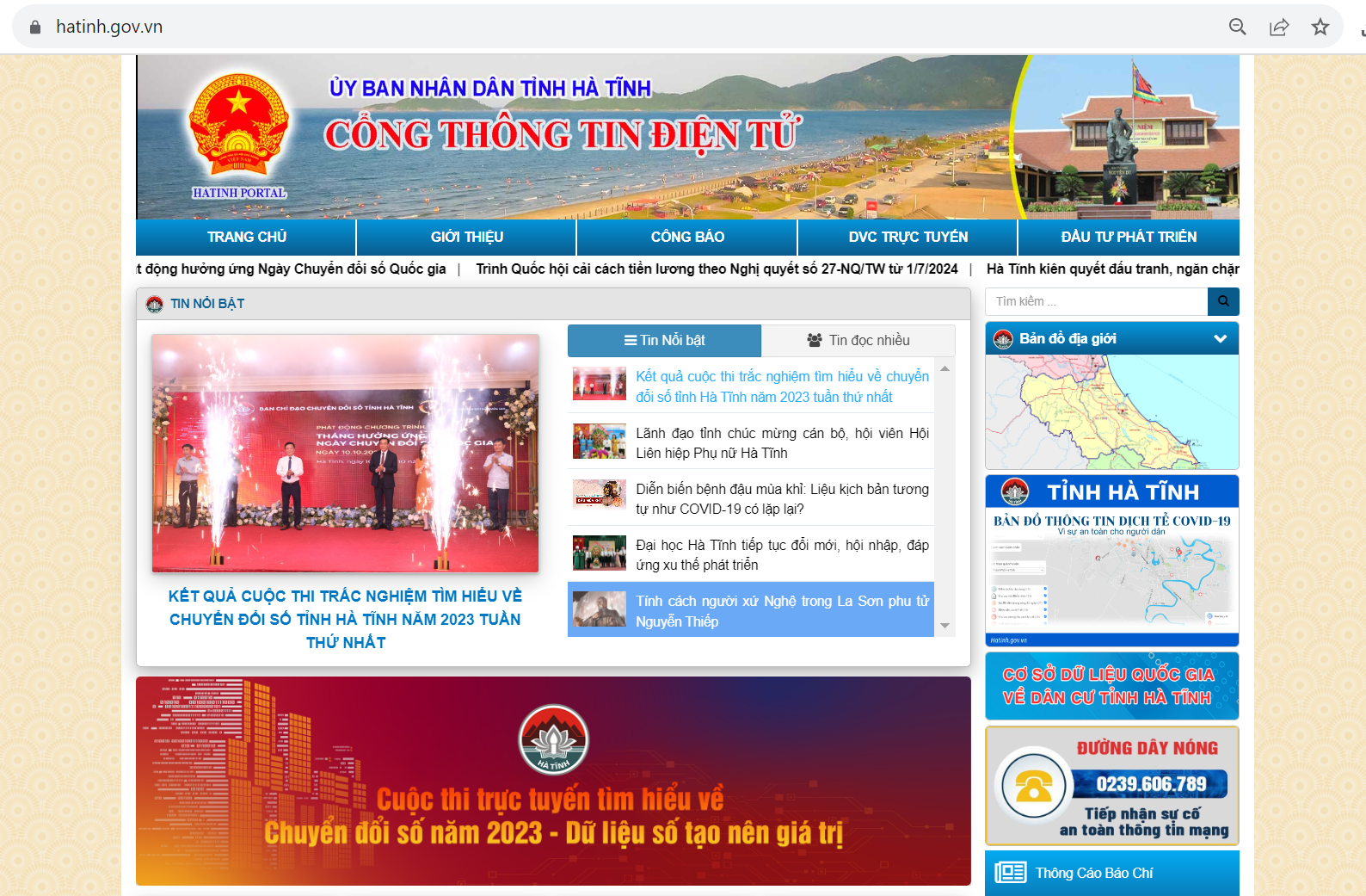 Cuộc thi trắc nghiệm tìm hiểu về chuyển đổi số tỉnh Hà Tĩnh năm 2023 tuần thứ hai bắt đầu từ 08h ngày 23/10/2023 đến 18h00 ngày 29/10/2023. Ban Tổ chức Cuộc thi đề nghị các cơ quan, đơn vị tiếp tục phổ biến, quán triệt đến cán bộ, công chức, viên chức và tuyên truyền đến đoàn viên, hội viên và các tầng lớp Nhân dân tham gia Cuộc thi trên Cổng Thông tin điện tử tỉnh Hà Tĩnh tại địa chỉ: https://hatinh.gov.vn/