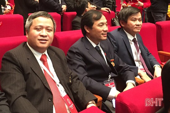 Đoàn đại biểu Hà Tĩnh gồm Bí thư Tỉnh ủy Hoàng Trung Dũng (ngồi giữa) và Chủ tịch UBND tỉnh Trần Tiến Hưng (bên trái) tham dự Đại hội. Ảnh: BHT