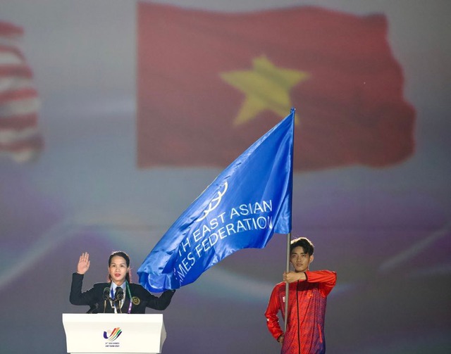 Vận động viên đấu kiếm Vũ Thành An và trọng tài quốc tế môn Muay Phan Thị Ngọc Linh đại diện cho các VĐV tham gia thi đấu và các trọng tài làm nhiệm vụ tại SEA Games 31 tuyên thệ.