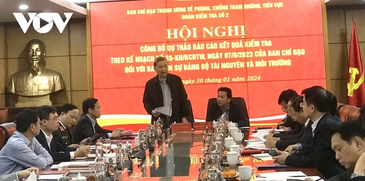 Chiều 10/1, ông Tô Lâm, Ủy viên Bộ Chính trị, Bộ trưởng Bộ Công an, Phó Trưởng Ban Chỉ đạo Trung ương về phòng, chống tham nhũng, tiêu cực chủ trì Hội nghị công bố dự thảo Báo cáo kết quả kiểm tra công tác thể chế hóa chủ trương, chính sách của Đảng về phòng, chống tham nhũng, tiêu cực thành pháp luật của Nhà nước theo Kế hoạch số 35 đối với Ban cán sự đảng Bộ TN&MT.