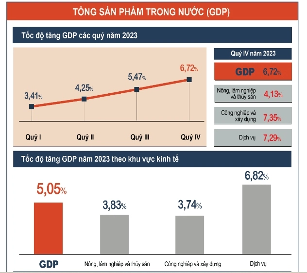 Vượt “cơn gió ngược” toàn cầu, GDP Việt Nam năm 2023 ước tăng 5,05% Năm 2023 tiếp tục là một năm nhiều sóng gió đối với kinh tế thế giới. Trong khi đại dịch vẫn đan