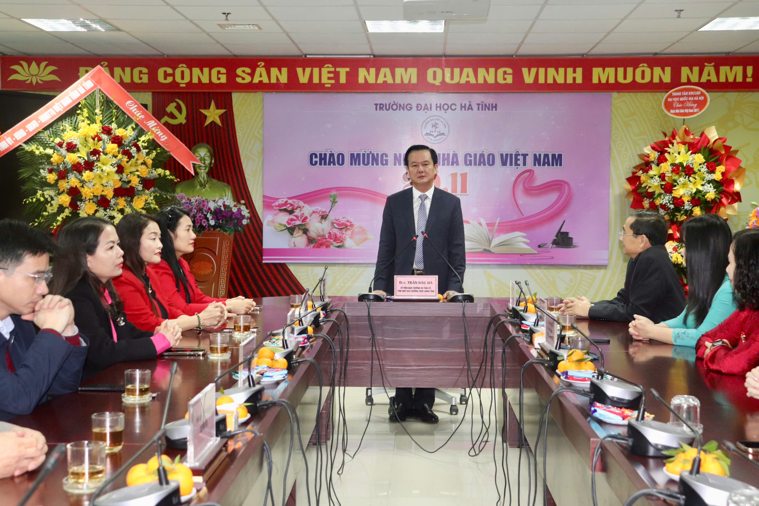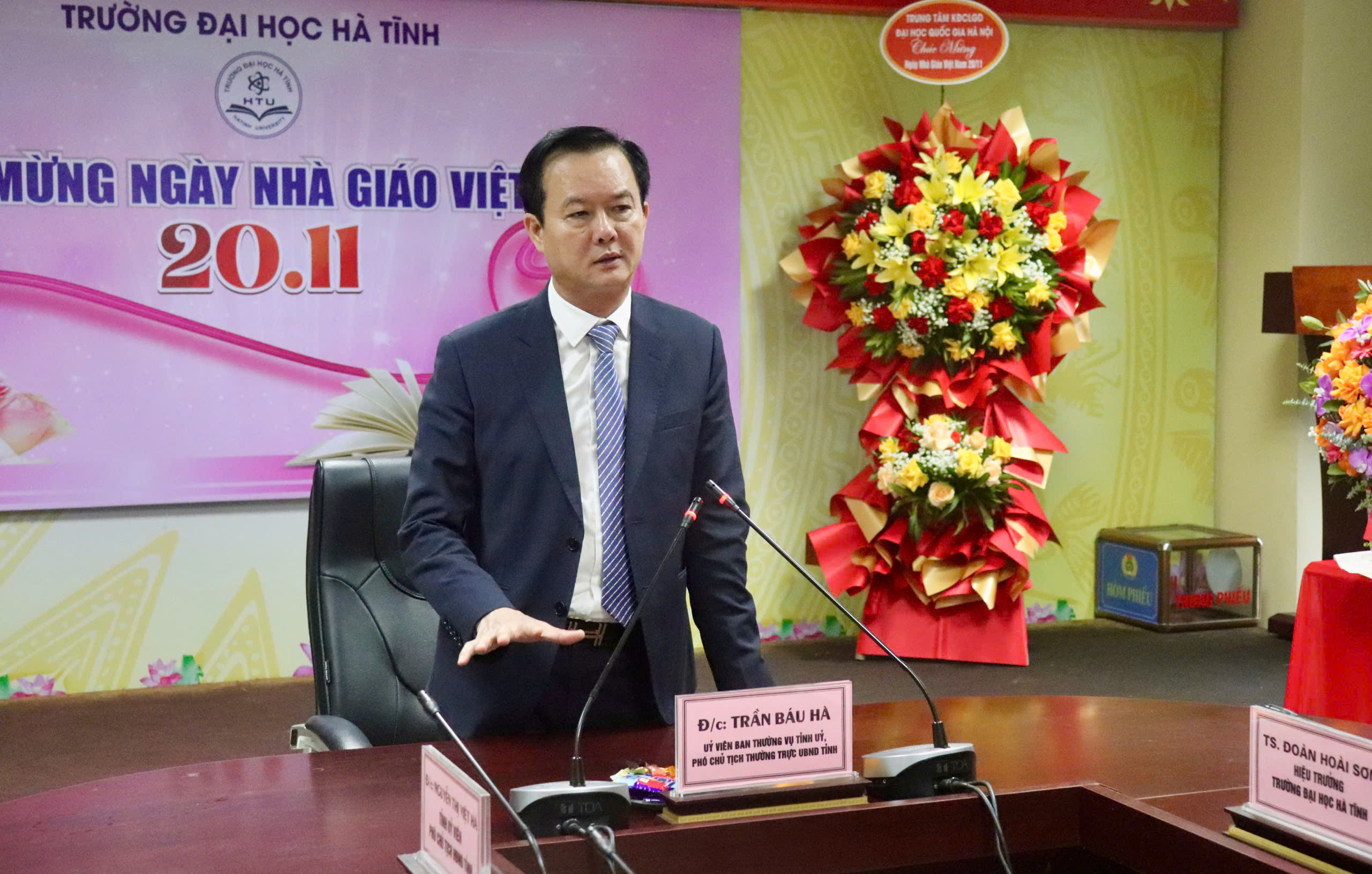 Đến tặng hoa, chúc mừng tập thể cán bộ, giáo viên Trường Đại học Hà Tĩnh, Phó Chủ tịch Thường trực UBND tỉnh Trần Báu Hà ghi nhận, đánh giá cao những kết quả mà nhà trường đạt được trong đào tạo nguồn nhân lực chất lượng cao phục vụ cho phát triển kinh tế, xã hội của tỉnh và khu vực.