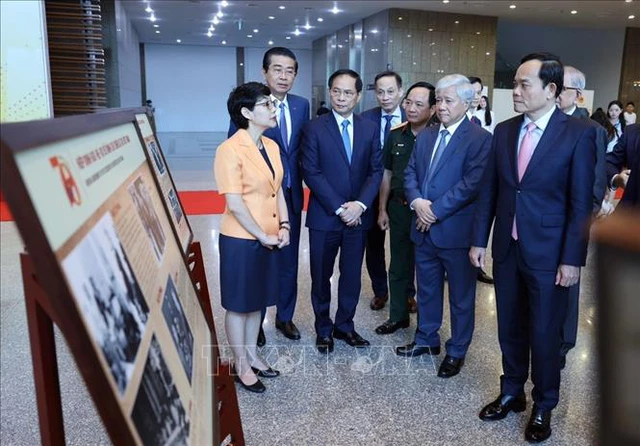 Lãnh đạo Đảng, Nhà nước tham quan trưng bày ảnh về Hiệp định Geneva. Ảnh: TTXVN