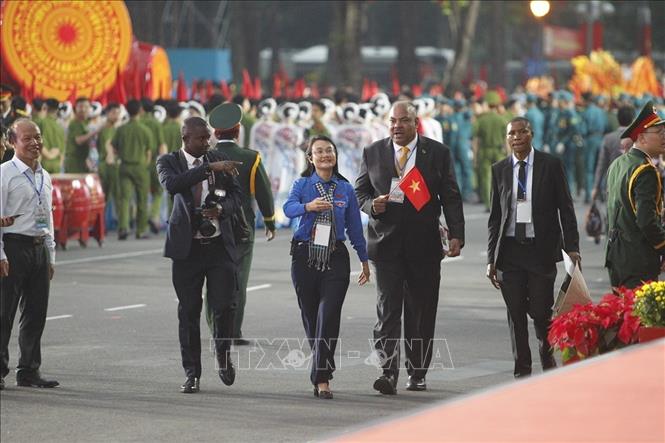 Các đại biểu khách mời quốc tế tham dự buổi lễ lần lượt đến khu vực khán đài trên đường Lê Duẩn, Quận 1. Ảnh: TTXVN