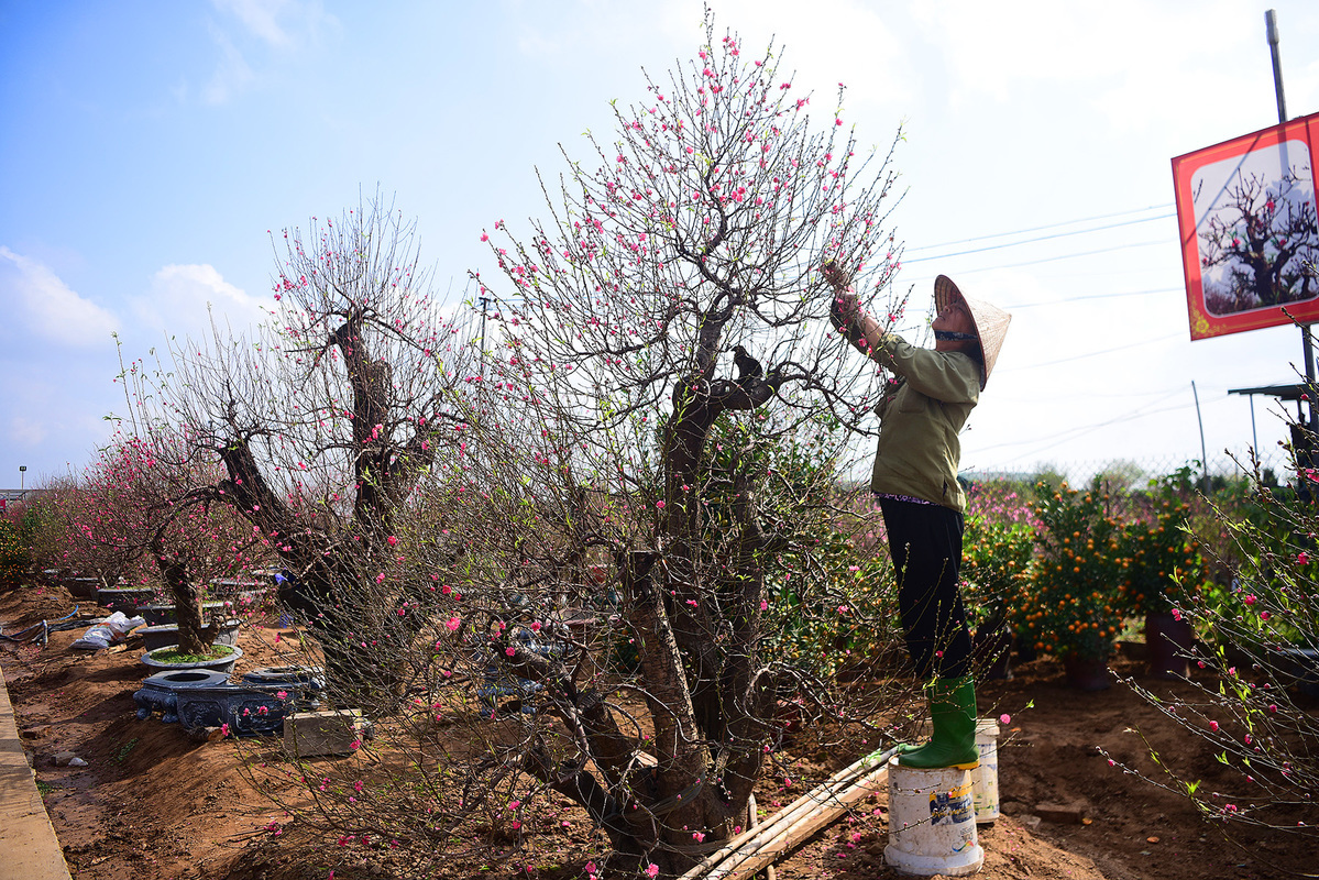 Người dân trồng đào Nhật Tân, Hà Nội chuẩn bị đón Tết Nguyên đán Canh Tý 2020. Ảnh: Giang Huy