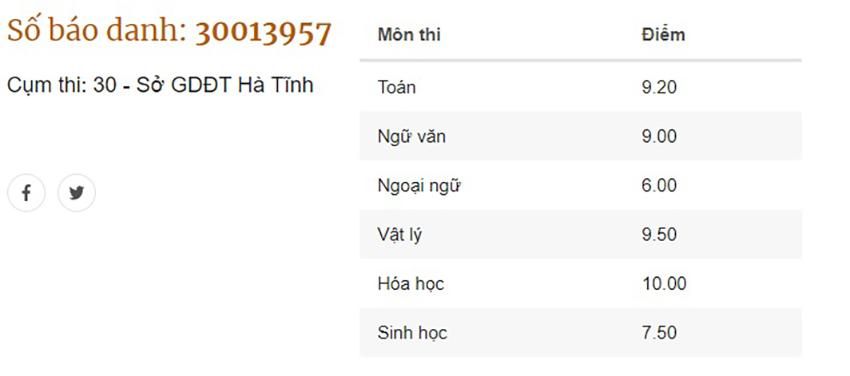Điểm thi của thủ khoa khối A00 tỉnh Hà Tĩnh.