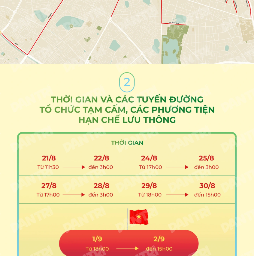 Ban tổ chức sẽ tiến hành tổng hợp luyện lần 2 vào 20h ngày 24/8; sơ duyệt vào 20h ngày 27/8; tổng duyệt vào 6h30 ngày 30/8 trước khi diễn ra lễ chính thức vào 6h30 ngày 2/9.