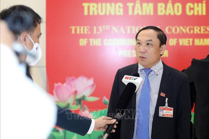 Đồng chí Võ Hồng Hải, Trưởng ban Tổ chức Tỉnh ủy Hà Tĩnh (Đoàn đại biểu Đảng bộ tỉnh Hà Tĩnh) trả lời phỏng vấn của phóng viên cơ quan thông tấn, báo chí sáng 29/1. Ảnh: TTXVN