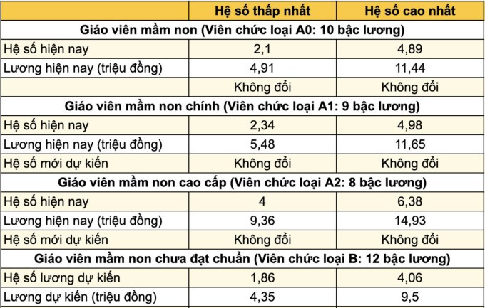 Theo đó, hệ số lương với thầy cô ở bậc mầm non không đổi, từ 2,1 đến 6,38.