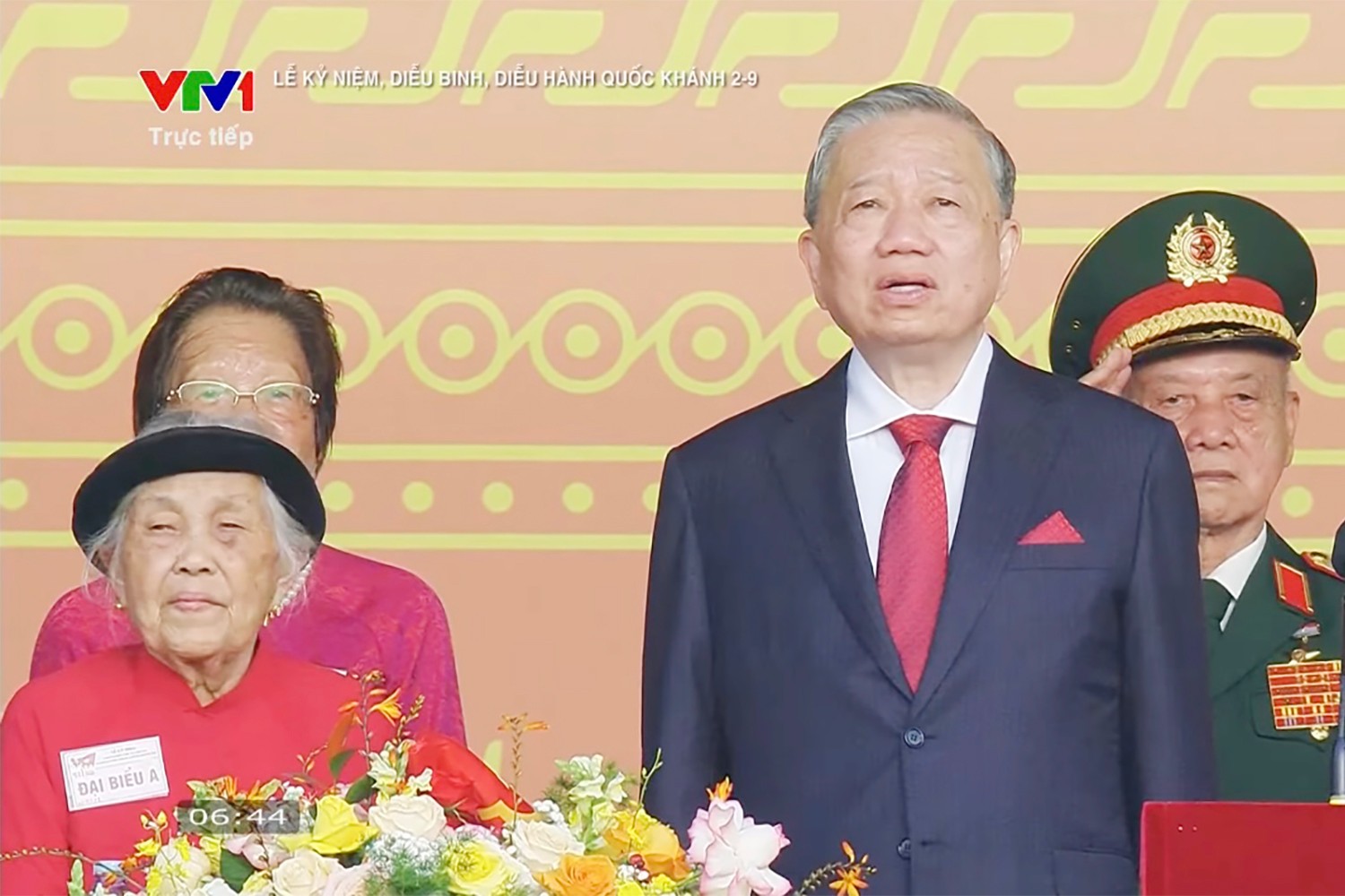 Mẹ Việt Nam Anh hùng Trần Thị Huyến ngồi bên cạnh Tổng Bí thư Tô Lâm tại buổi lễ diễu binh, diễu hành kỷ niệm 80 năm Cách mạng Tháng Tám thành công và Quốc khánh nước Cộng hòa Xã hội chủ nghĩa Việt Nam diễn ra vào sáng 2/9. (Ảnh: Nguồn VTV)